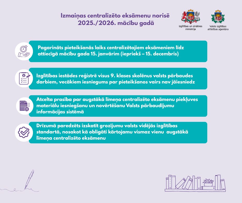 2025. gada 4. novembrī Ministru kabinets apstiprinājis 2025./2026. mācību gada valsts pārbaudes darbu grafiku un pagarinājis pieteikšanās laiku centralizētajiem eksāmeniem līdz 15. janvārim. Atcelta arī prasība par augstākā līmeņa centralizēto eksāmenu piekļuves materiālu iesniegšanu un novērtēšanu Valsts pārbaudījumu informācijas sistēmā.